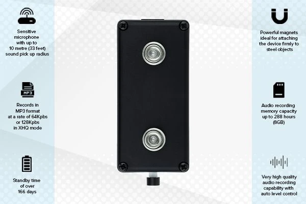 We have now launched a new alternative version of this current best-selling product to give it even more versatility. As a cost option, you can now order the extended microphone version of the Enduro by selecting this from the drop-down menu (where you will find the option to buy without deployment magnets). This extended mic. the version has an external microphone with a lead of approximately 1 metre in length. This means that the unit can be hidden away from sight and the microphone placed in a semi-exposed position, which may be more suitable in some circumstances. Also, the very small microphone could be inserted under a door or maybe through a keyhole to enable listening into a neighbouring room. The possibility of deploying the extended microphone Enduro in different ways is merely limited by your imagination.